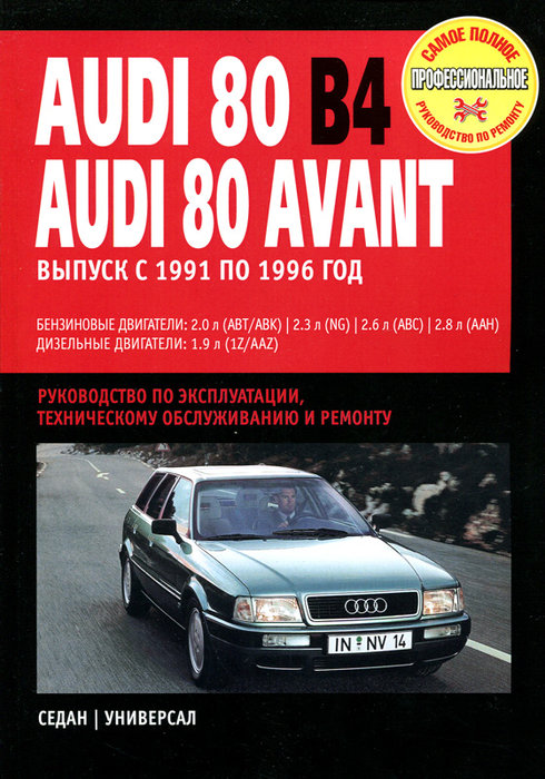 Справочное иллюстрированное издание руководство по эксплуатации Ауди 80, Ауди 80 Авант, Ауди 80 В4, устройство, инструкция по ремонту и техобслуживанию Audi 80 B4 / Audi 80 Avant, которые выпускались с 1991 по 1996 годы в кузовах седан и универсал, оборудовались бензиновыми 4-х цилиндровыми рядными объемом 2,0 л. 8V (90 и 115 л.с, АВТ / АВК), 5-ти цилиндровыми рядными объемом 2,3 л. 10V (133 л.с, NG), 5-ти цилиндровыми рядными объемом 2,6 л. 10V (150 л.с, ABC), 6-ти цилиндровыми VR объемом 2,8 л (174 л.с, ААН) двигателями, а также 4-х цилиндровыми рядными дизелями объемом 1,9 л. 8V (75 и 90 л.с, AAZ / 1Z). Коробки передач устанавливались либо 5-ти ступенчатая механика, либо 4-х ступенчатый автомат.