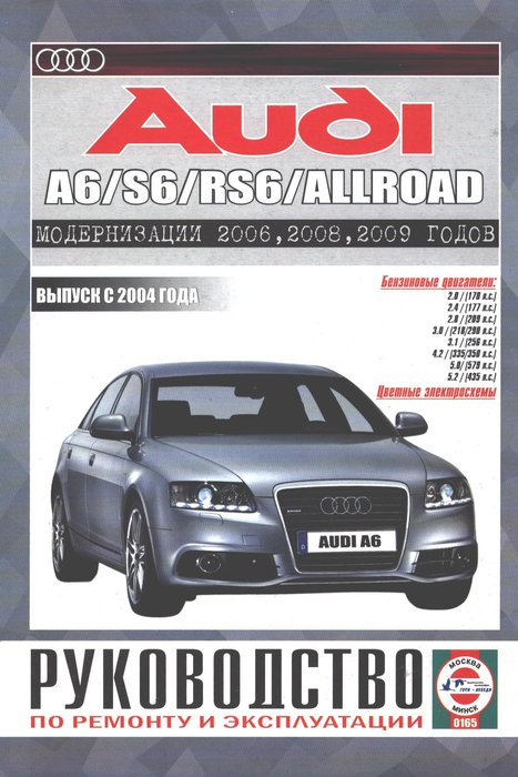 Справочное иллюстрированное подробное издание Книга по ремонту Audi A6 / S6 / RS6 / Allroad, устройство, руководство по эксплуатации и техническому обслуживанию Audi A6 / S6 / RS6 / Allroad, которые выпускались с 2004 года (включая модернизации 2006, 2008 и 2009 годов). Оснащается модель бензиновыми двигателями литражом 2,0, 2,4, 2,8, 3,0, 3,1, 4,2, 5,0, 5,2.