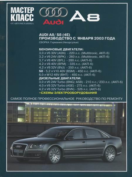 Издание справочно-информационное Руководство по ремонту Audi A8, а также устройство, руководство по эксплуатации и техническому обслуживанию автомобилей Audi A8 с 2003 г. выпуска, оборудованных бензиновыми двигателями ASN, BPK, BFL, BFM, BVJ, BSM, BHT рабочим объемом 3,0, 3,2, 3,7, 4,2, 5,2, 6,0 л. и дизельными двигателями BNG, ASB, ASE, BVN рабочим объемом 3,0, 4,0, 4,2 л.