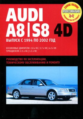 Справочное иллюстрированное издание Пособие по ремонту Ауди A8 / Ауди S8 4D, устройство, руководство по эксплуатации и техническому обслуживанию Ауди A8 / Ауди S8 4D (тип 4D2 / 4D8), которые выпускались с 1994 по 2002 года, оборудовались бензиновыми двигателями литражом 2,8, 3,7, 4,2, а также турбодизелями литражом 2,5 и 3,3. Автомобили либо с передним либо постоянным полным Quattro приводом. КП установлены или 5-ти, 6-ти ступенчатая механика, или 5-ти ступенчатый автомат.