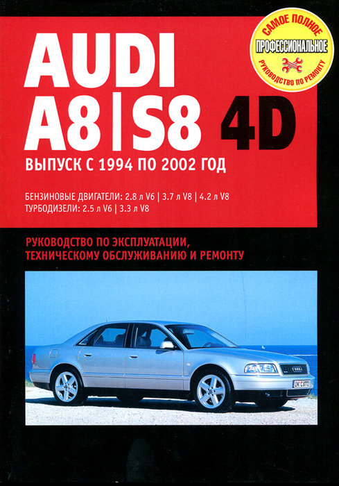 Справочное иллюстрированное издание Пособие по ремонту Ауди S8 4D / Ауди A8, устройство, руководство по эксплуатации и техническому обслуживанию Ауди S8 4D / Ауди A8 (тип 4D2 / 4D8), которые выпускались с 1994 по 2002 года, оборудовались бензиновыми двигателями литражом 2,8, 3,7, 4,2, а также турбодизелями литражом 2,5 и 3,3. Автомобили либо с передним либо постоянным полным Quattro приводом. КП установлены или 5-ти, 6-ти ступенчатая механика, или 5-ти ступенчатый автомат.