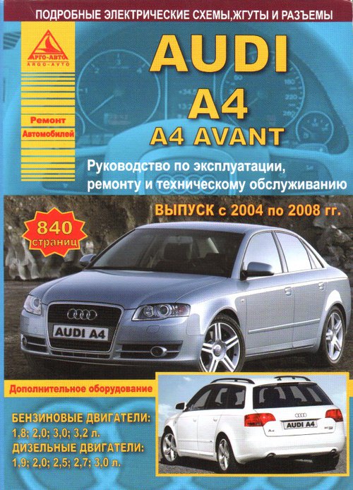 Справочное иллюстрированное подробнейшее издание руководство по техническому обслуживанию Ауди А4, Ауди А4 Авант, устройство Audi A4, Audi A4 Avant, руководство по эксплуатации и ремонтным процедурам Audi A4, Audi A4 Avant, которые выпускались с 2004 по 2008 годы, с кузовами седан и универсал Avant, оборудованных бензиновыми двигателями литражом 1,8, 2,0, 3,0, 3,2, а также дизелями литражом 1,9, 2,0, 2,5, 2,7, 3,0.