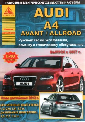 Подробнейшее справочное пособие по ремонту Audi А4 / Audi A4 Avant / Audi A4 Allroad, руководство по устройству, эксплуатации и техническому обслуживанию автомобилей Audi А4 / Audi A4 Avant / Audi A4 Allroad с 2007 г. выпуска и рестайлинговой модели с 2012 г. выпуска, оборудованных бензиновыми двигателями рабочим объемом 1,8, 2,0, 3,0, 3,2 л. и дизельными силовыми агрегатами рабочим объемом 2,0, 2,7, 3,0 л. Ремонт узлов и агрегатов Ауди А4. Эксплуатация, ТО, устройство, электрические схемы, жгуты, разъемы.