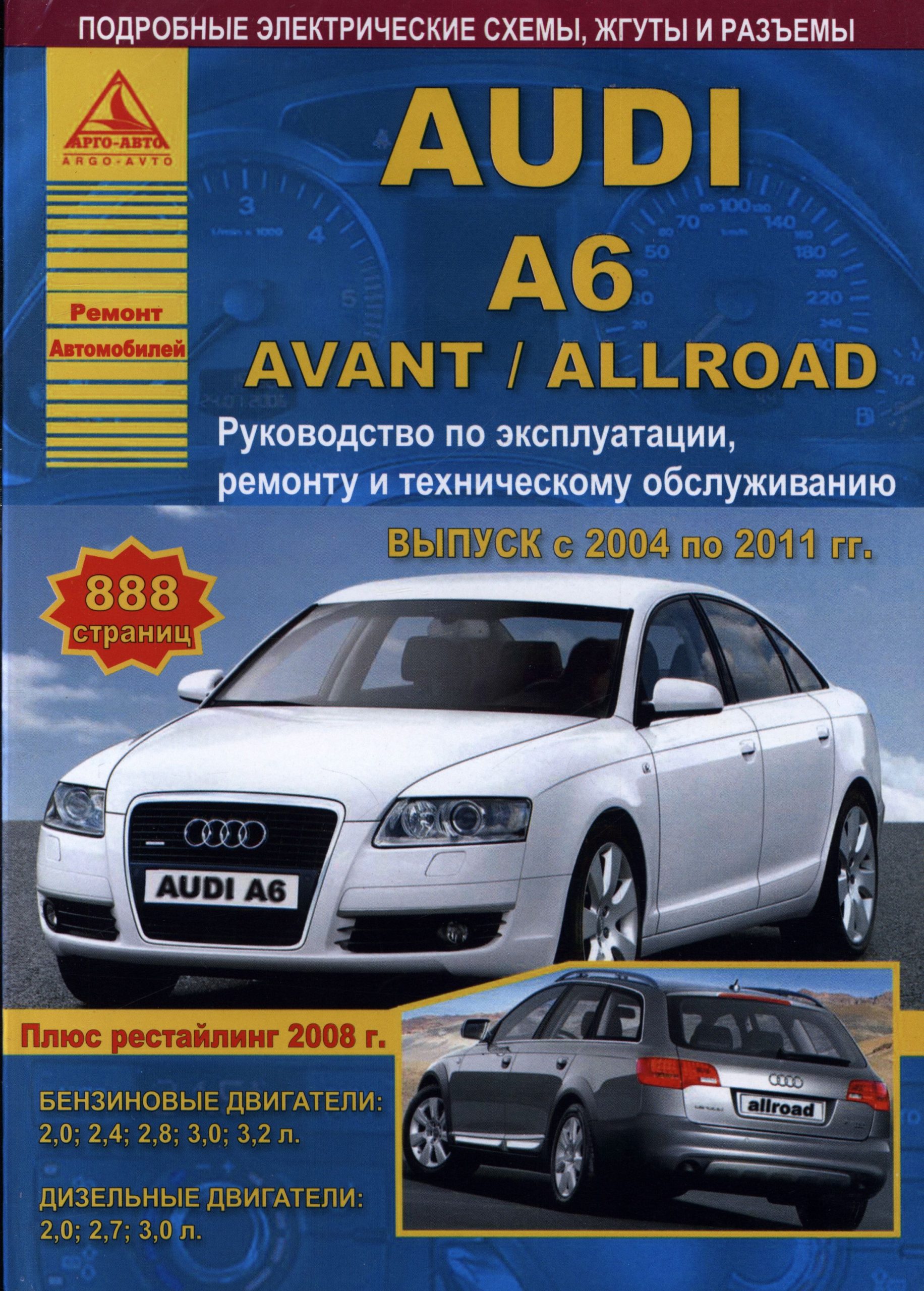 Максимально подробное руководство по проведению ремонта Audi Allroad / Audi A6 / Audi A6 Avant, руководство по обслуживанию Audi Allroad, а также Audi A6 Avant / Audi A6 Avant и пособие по эксплуатации немецких автомобилей Audi Allroad / Audi A6 / Audi A6 Avant 2004-2011 годов производства (в том числе рассмотрены автомобили образца 2008 года). Модели Ауди Олроад, Ауди А6, Ауди А6 Авант приводятся в действие моторами, работающими на бензине объемом 2,0, 2,4, 2,8, 3,0, 3,2 л., дизелями литражом 2,0, 2,7, 3,0 л. Ремонт узлов и агрегатов Ауди Аллроад. Эксплуатация и ТО. Электросхемы, жгуты, разъемы.