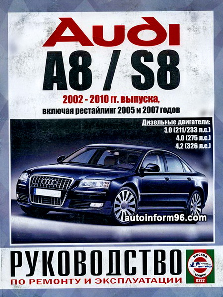 Руководство по ремонту Ауди А8, инструкция по эксплуатации Aуди А8 и S8, выпущенных с 2002 по 2010 года, включая рестайлинг 2005 и 2007 год, оснащенных дизельными двигателями рабочим объемом 3,0 , 4,0 и 4,2 литра, мощностью 211/233 , 275 и 326 лошадиных сил соответственно. Ремонт узлов и агрегатов Audi A8. Рекомендации по ТО и эксплуатации. Электрические схемы.