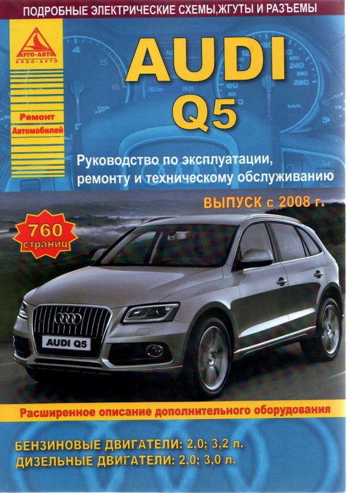 Подробнейшее справочное руководство по ремонту Ауди Q5, информация по устройству Audi Q5, рекомендации по эксплуатации и техническому обслуживанию Audi Q5 с 2008 года выпуска. Эти великолепные кроссоверы оборудованы бензиновыми моторами рабочим объемом 2,0, 3,2 л., а также дизельными силовыми агрегатами, обладающими объемом 2,0 и 3,0 л. Ремонт узлов и агрегатов Ауди Ку5. Электросхемы, жгуты, разъемы. Эксплуатация, техобслуживание, описание дополнительного оборудования.