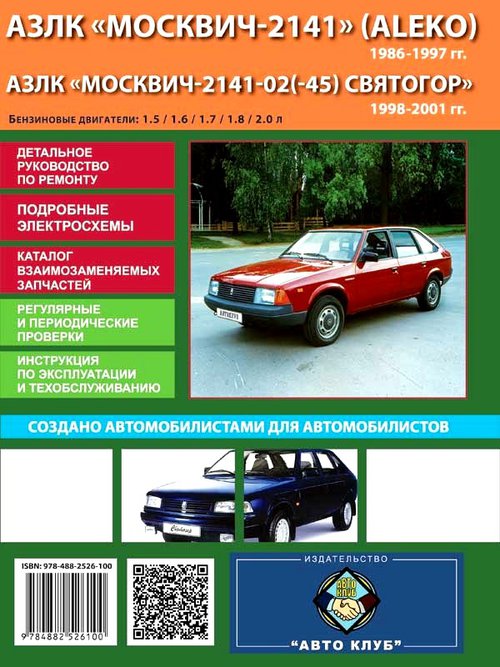Универсальный практический мануал по ремонту Москвич Святогор, включающее инструкцию по эксплуатации, техническое обслуживание и каталог деталей автомобилей Москвич 2141-02(-45), выпущенных в период с 1986 по 1997 год и оборудованных бензиновыми двигателями рабочим объемом 1,5, 1,6, 1,7, 1,8, 2,0 л.
