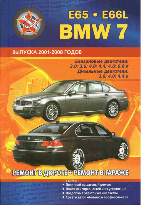 Справочное подробное иллюстрированное издание Инструкция по ремонту БМВ 7 (Е65, Е66Л), устройство БМВ 7 (Е65, Е66Л), руководство по эксплуатации и техническому обслуживанию БМВ 7-й серии (Е65, Е66Л), которые выпускались с 2001 по 2008 год и оборудовались бензиновыми двигателями литражом 3,0, 3,6, 4,0, 4,4, 4,8, 6,0, а также дизелями литражом 3,0, 4,0, 4,4.