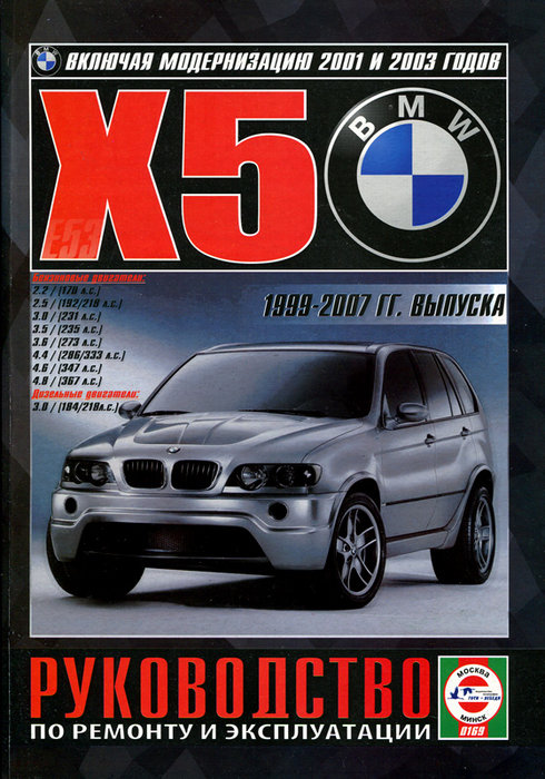 Справочно-информационное издание Книга по ремонту BMW X5, а также руководство по техническому обслуживанию и эксплуатации, устройство BMW X5 с 1999-2007 гг. выпуска, включая модернизацию 2001 и 2003 годов, оборудованных бензиновыми двигателями рабочим объемом 2,2 (170 л.с.), 2,5 (192 / 216 л.с.), 3,0 (231 л.с.), 3,5 (235 л.с.), 3,6 (273 л.с.), 4,4 (286 / 333 л.с.), 4,6 (347 л.с.), 4,8 л. (367 л.с.), а также дизельными двигателями рабочим объемом 3,0 л.