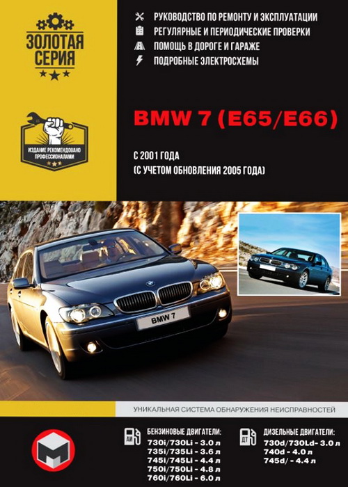 Высокоуровневое профессиональное руководство по ремонту BMW 7 серии (Е65 и Е66), а также инструкция по эксплуатации и техническому обслуживанию, устройство и диагностика неисправностей БМВ 7 серии с 2001 года выпуска, в том числе и рестайлинговые модели с 2005 года, оборудованные бензиновыми двигателями 730i/730Li рабочим объемом 3,0 л, 735i/735Li – 3,6 л, 745i/745Li – 4,4 л, 750i/750Li – 4,8 л, 760i/760Li – 6,0 л и дизельными двигателями 730d/730Ld рабочим объемом 3,0 л, 740d – 4,0 л, 745d – 4,4 л. Ремонт БМВ 7. Инструкция по эксплуатации. Рекомендации по ТО. Система определения неисправностей. Электросхемы.