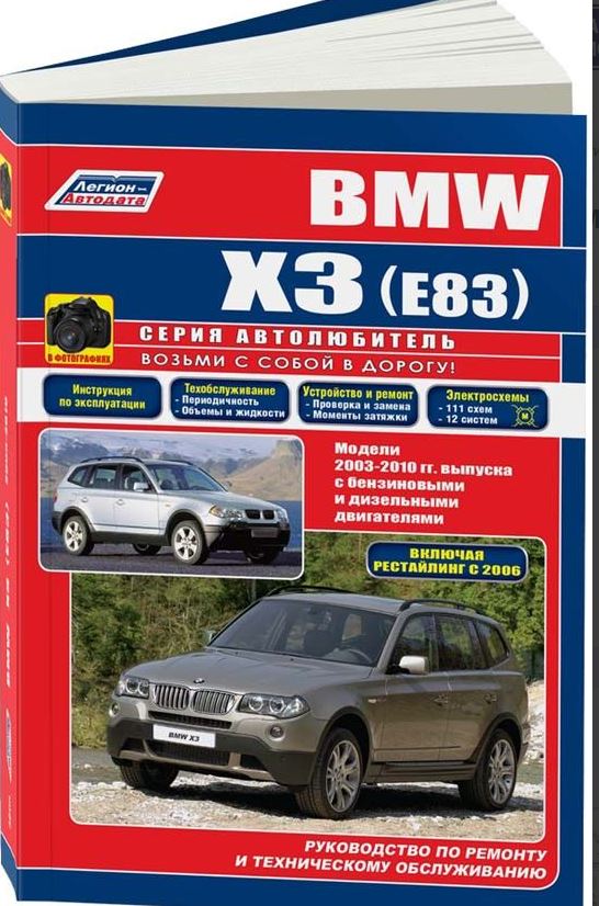 Подробнейшее справочно-информационное издание руководство по ремонту БМВ Х3, а также руководство по эксплуатации и техническому обслуживанию, устройство автомобилей BMW X3 (кузов E83) 2003-2010 гг. выпуска оборудованных бензиновыми двигателями N46B20 (2,0 л.), M54B25 (2,5 л.), N52K B25 (2,5 л.), M54B30 (3,0 л.), N52K B30 (3,0 л.), а также дизельными и турбодизельными двигателями М47Т2 (2,0 л.), N47 (2,0 л.), M57T (3,0 л.), M57T2 (3,0 л.), оснащенные как механической, так и автоматической коробкой передач. Рекомендации по эксплуатации и ТО. Устройство, проверки, моменты затяжек. Схемы электрических соединений БМВ Х3 Е83.