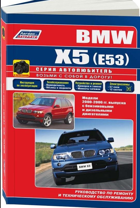 Справочно-информационное иллюстрированное пособие Руководство по ремонту БМВ Х5 Е53, а также руководство по эксплуатации и техническому обслуживанию, устройство автомобилей BMW Х5 модели Е53, оборудованных бензиновым рядным 6-цилиндровыми М54В30 (04.2000-2006), V-образными 8-цилиндровыми М62В44 (09.1999-09.2003), М62В46 (09.2002-09.2003), N62B44 (09.2003-09.2006), N62B48 (04.2004-09.2006) двигателями и рядными 6-цилиндровыми дизельными двигателями M57D30 (04.2003-09.2003) и M57D30TU (09.2003-09.2006). Ремонт БМВ Х5 в 53 кузове. Эксплуатация. Устройство. Техобслуживание. Электрические схемы.
