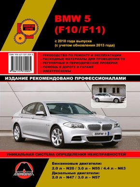 Справочно-иллюстрированное руководство по ремонту БМВ 5 (F10 / F11), а также пособие по эксплутации и техническому обслуживанию автомобилей BMW 5 с 2010 года выпуска, учитывая обновления 2013 года. Автомобили оборудованы бензиновыми двигателями N20 (2,0 л.), N55 (3,0 л.), N63 (4,4 л.), а также дизельными двигателями N47 (2,0 л.), N57 (3,0 л.). Ремонт БМВ 5. Инструкция по эксплуатации. Рекомендации по ТО. Схемы электрооборудования.