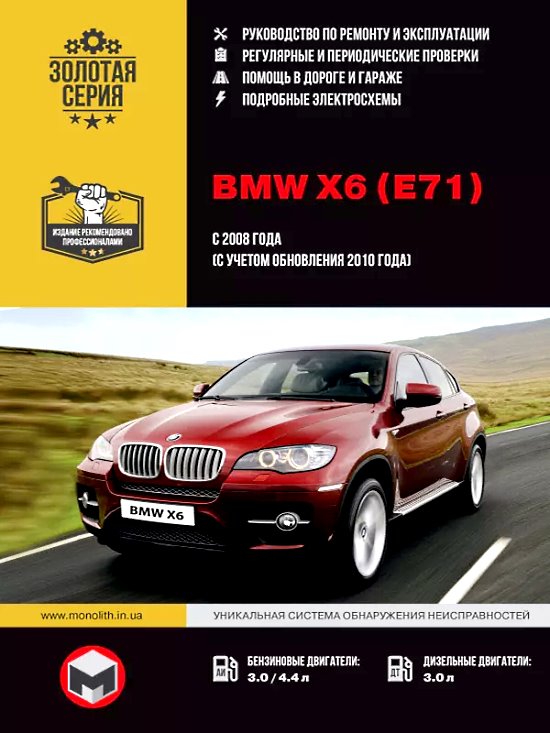 Руководство (мануал) по ремонту и эксплуатации BMW X6. В электронной книге рассмотрены автомобили первого поколения (индекс кузова E71): 2008 – 2014 года выпуска с бензиновыми и дизельными двигателями.