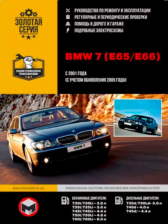 Руководство (мануал) по ремонту и эксплуатации BMW 7 серии. В электронной книге рассмотрены автомобили четвертого поколения (индекс кузова E65 / E66) 2001 – 2008 года выпуска с бензиновыми и дизельными двигателями.