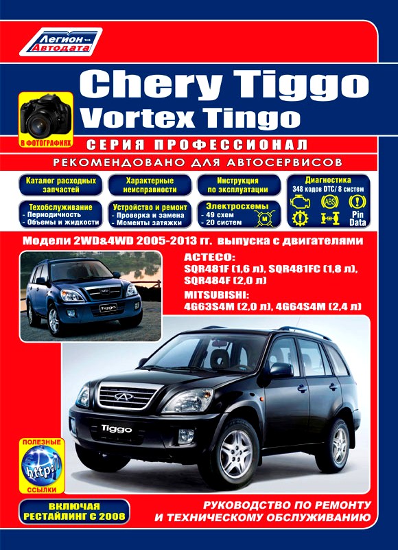 Профессиональное в фотографиях информационно-справочное пособие по ремонту Chery Tiggo / Vortex Tingo, а также руководство по эксплуатации и техническому обслуживанию автомобилей Черри Тиго / Вортекс Тинго 2005-2013 гг. выпуска (рестайлинг 2008 года), оборудованных бензиновыми двигателями ACTECO: SQR481F (1,6 л) SQR481FC (1,8 л), SQR484F (2,0 л); MITSUBISHI: 4G63S4M (2,0 л), 4G64S4M (2,4 л). 2WD&4WD. Каталог расходных запчастей. Ремонт. узлов и агрегатов Чери Тигго. Эксплуатация. Устройство. Диагностика. Электрические схемы. Неисправности Чери Тигго.