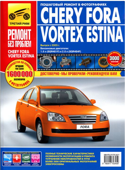 Информационно-справочное с многочисленными цветными иллюстрациями издание Руководство по ремонту Чери Фора / Vortex Estina, а также инструкция по эксплуатации и техническому обслуживанию, книга устройство Chery Fora / Vortex Estina c 2005 г. выпуска, оборудованных бензиновыми двигателями рабочим объемом 1,6 и 2,0 л. Цветные фотографии. Пошаговый ремонт Чери Фора. Инструкция по эксплуатации. Схемы электрооборудования.