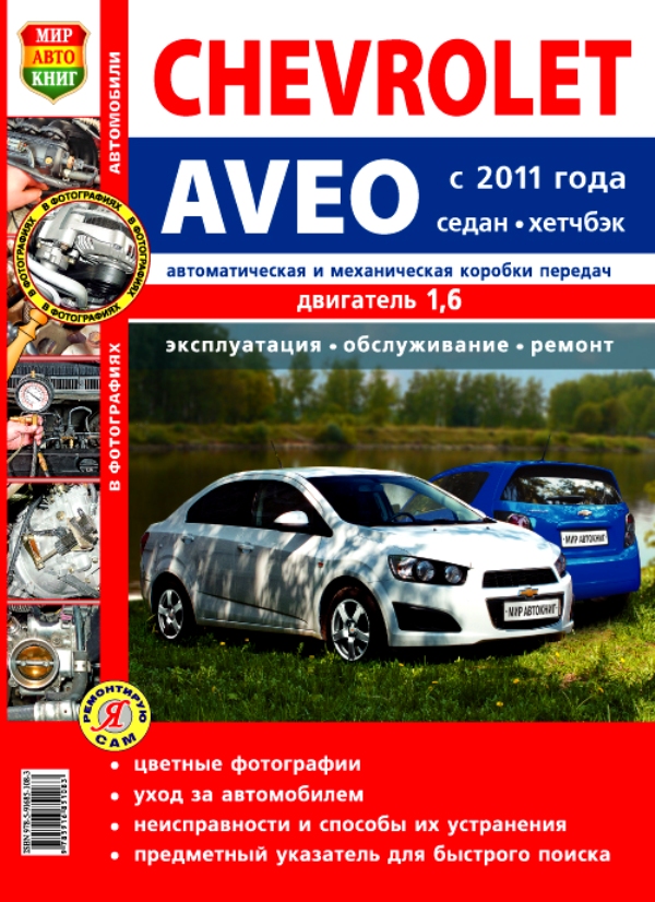 Цветная иллюстрированная книга по ремонту Chevrolet Aveo, а также руководство по эксплуатации и техническому обслуживанию автомобилей Шевроле Авео с 2011 года выпуска в кузовах седан и хетчбэк, оснащенных двигателями рабочим объемом 1,6 л. Машины оборудованы автоматическими или механическими коробками передач.
