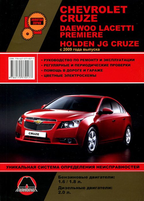 Все издательства, специализирующиеся на автокнигах, выпуская в тираж очередную техническую брошюру ставят ей первоочередную задачу быть в случае технической неисправности первым и возможно основным помощником будущему хозяину – при диагностике состояния машины, срочного ремонта или другой подобной необходимости. Настоящее пособие Chevrolet Cruze / Dewoo Lacetti Premiere / Holden JG Cruze безусловно входит в ряд лучших технических мануалов, таких как любая из книг Золотой серии издательства Монолит. Профессиональное и очень грамотно составленное руководство не обременит пользователя долгим поиском нужной ему информации (чему в том числе поспособствует словарь аббревиатур), сможет дать ответы на большинство возникающих технических вопросов и в процессе эксплуатации, и при непосредственном ремонте. Когда Вы думаете отправиться в дальнюю дорогу необходимо помнить, что обнаружить когда необходимо качественный автосервис будет крайне проблематично. Ведь если в домашней обстановке или на городских улицах в случае неполадки можно всегда обратиться к знакомому приятелю-технарю или же на профсервис, то на дорожном отрезке уже в десятках километров от любого крупного города техподдержку возможно придется ожидать достаточно долго. Все чаще водители, ранее обжегшись подобным образом, делают элементарный вывод, что нет смысла подвергать себя риску и лучше возить с собой пособие по ремонту Chevrolet Cruze / Daewoo Lacetti Premiere / Holden JG Cruze, застраховав себя в будущем от потенциальных форс-мажоров. Во первых с его помощью очень много проблем можно решить самостоятельно. Во вторых если всё же приходится отправлять автомобиль до ближайшей автомастерской на трассе, то когда прозвучит далеко не праздный дежурный вопрос от местных техников: “Вы случайно не захватили с собой ремонтное пособие Шевролет Круз, Деу Лацетти Премьер, Холден ЖГ Круз?”, уже имеющие определенный негативный опыт автомобилисты ответят, что конечно захватили и совсем не случайно!Последнее время мы с удовольствием рассказываем и о том, что приобретая мануал по техобслуживанию сначала лишь непосредственно для ремонта, многие со временем находят таким брошюрам и другое применение. Оказывается подобные руководства очень хороши и как обучающая литература для молодых поколений! Они способствуют привлечению внимания молодежи к технике, рассказывают о всех основных автопремудростях, а также учат грамотной эксплуатации машины.