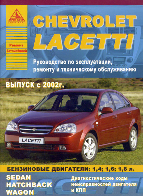 Информационно-справочное издание Пособие по обслуживанию Chevrolet Lacetti, а также руководство по ремонту и эксплуатации автомобилей Chevrolet Lacetti Sedan, Lacetti Hatchback, Lacetti Wagon с 2002 г. выпуска, оборудованных бензиновыми двигателями рабочим объемом 1,4, 1,6, 1,8 л.