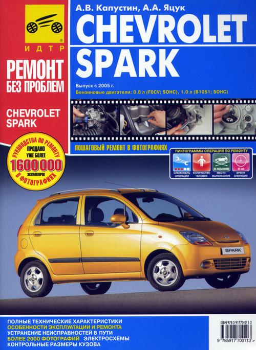 Цветное справочно-информационное пособие Руководство по ремонту Chevrolet Spark, а также руководство по эксплуатации и техническому обслуживанию, устройство Chevrolet Spark с 2005 г. выпуска, оборудованных бензиновыми двигателями рабочим объемом 0,8 (F8CV; SOHC), 1,0 л. (B10S1; SOHC). Цветные фотографии.