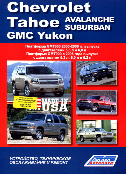 Подробнейшее иллюстрированное информационно-справочное издание Книга по ремонту Chevrolet Suburban / Chevrolet Tahoe / Chevrolet Avalanche, GMC Yukon. Также в мануале рассмотрено устройство, руководство по эксплуатации и процедурам связанным с техническим обслуживанием Chevrolet Suburban / Chevrolet Tahoe / Chevrolet Avalanche, GMC Yukon платформы GMT800, которые производились в период с 2000 по 2006 года и оборудовались бензиновыми двигателями рабочим объемом 5,3 и 6,0 л., а также те же модели, но платформы GMT900 с 2006 г. выпуска, оборудованные бензиновыми движками литражом 5,3, 6,0, 6,2.
