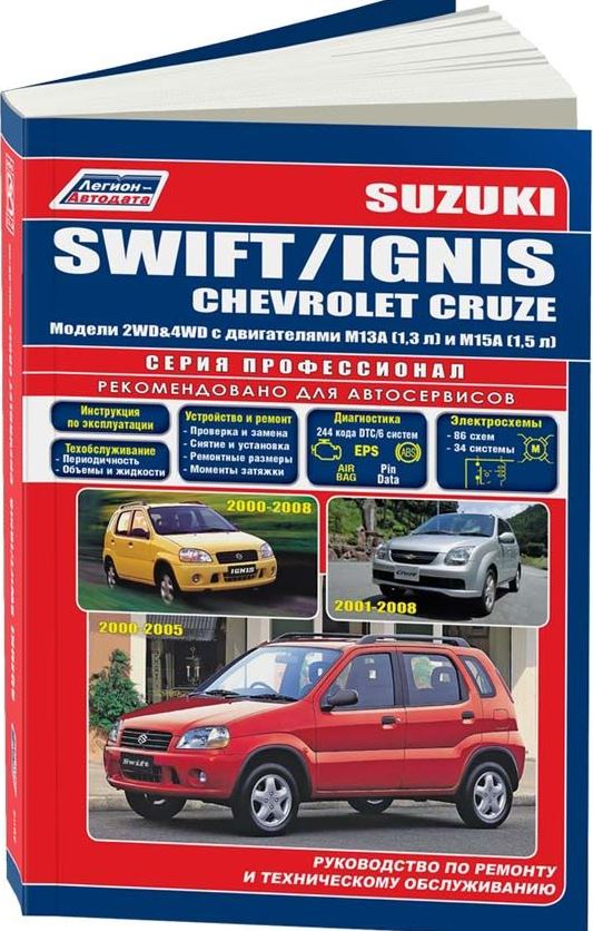 Иллюстрированное справочно-информационное издание Книга по ремонту Chevrolet Cruze, а также руководство по эксплуатации и операциям связанным с техобслуживанием, а также подробно описанное устройство таких марок автомашин как Chevrolet Cruze выпускавшихся в 2001-2008 годах, Suzuki Swift 2000-2005 гг. выпуска, Suzuki Ignis c 2000 года выпуска, оборудованных двигателями на бензине, моделей M13A объемом 1,3, и M15A объемом 1,5 л. Ремонт узлов и агрегатов Шевроле Круз. Эксплуатация. ТО. Диагностика. Устройство. Электрические схемы.