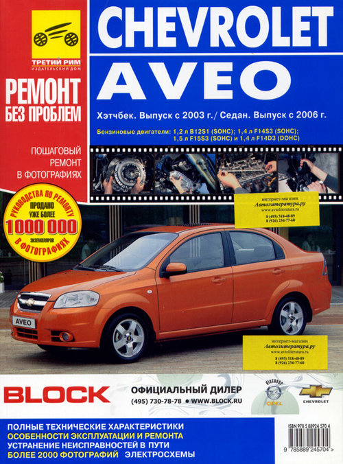Иллюстрированное в цвете справочное пособие Руководство по ремонту Chevrolet Aveo, а также руководство по техническому обслуживанию и эксплуатации, устройство автомобилей Chevrolet Aveo с 2003 г. выпуска, с кузовами седан и хэтчбек, оборудованных бензиновыми двигателями B12S1, F14D3, F15S3, F14S3 рабочим объемом 1,2, 1,4, 1,5 л. Пособие содержит более 2000 фотографий, подробно освещающих весь процесс пошагового ремонта автомобиля Шевроле Авео. Детально описывается ремонт всех узлов и агрегатов автомобиля, Описания и фотографии снабжаются подробной технической информацией, которая поможет Вам освоиться в специальной терминологии. В отдельные разделы книги входят инструкция по эксплуатации Chevrolet Aveo, рекомендации по техническому обслуживанию, цветные электросхемы (схемы электрооборудования) автомобиля.