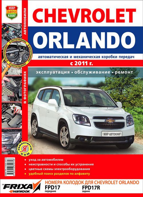 Справочно-информационное, в которое включены подробные цветные фотографии руководство по ремонту Chevrolet Orlando, а также устройство Chevrolet Orlando, руководство по эксплуатации Chevrolet Orlando и руководство по техническому обслуживанию Chevrolet Orlando. Производственный выпуск модели Шевроле Орландо осуществляется с 2011 года. Машины оснащены бензиновыми моторами рабочим объемом 1,8 л. (1796 см³, 141 л.с.), МКПП (5 ступеней) или АКПП (6 ступеней).