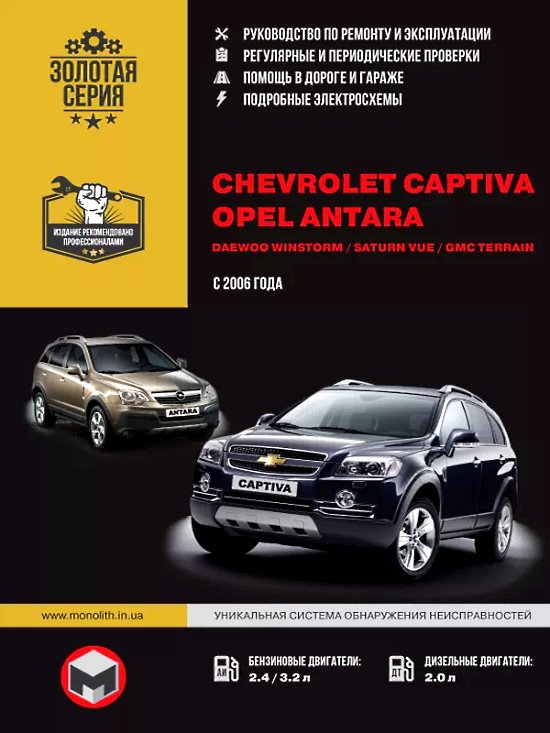 Руководство (мануал) по ремонту и эксплуатации Шевроле Каптива и Опель Антара. В электронной книге рассмотрены автомобили первого поколения (индекс платформы С100 / С105) с 2006 по 2011 года выпуска с бензиновыми и дизельными двигателями.