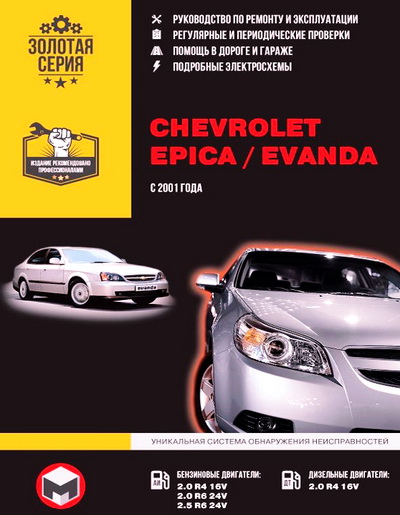 Справочное издание Руководство по ремонту Chevrolet Epica / Chevrolet Evanda, а также руководство по техническому обслуживанию и эксплуатации, устройство Chevrolet Epica / Evanda с 2006 г. выпуска, оборудованных бензиновыми двигателями рабочим объемом 2,0 и 2,5 л., а также дизельными двигателями рабочим объемом 2,0 л. Ремонт Шевроле Эпика. Инструкция по эксплуатации. Схемы электрооборудования.