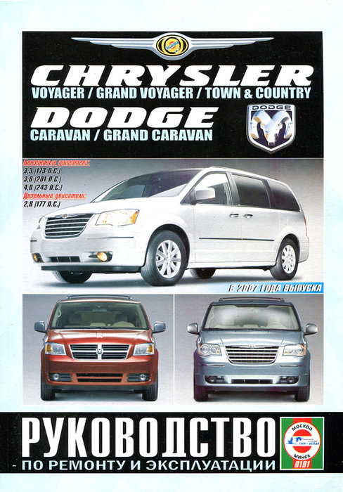 Справочное иллюстрированное издание руководство по ремонту и эксплуатации Chrysler Town & Country Chrysler Grand Voyager / Chrysler Voyager, Dodge Caravan / Dodge Grand Caravan, устройство Chrysler Town & Country Chrysler Grand Voyager / Chrysler Voyager, Dodge Caravan / Dodge Grand Caravan, руководство по техническому обслуживанию Chrysler Town & Country Chrysler Grand Voyager / Chrysler Voyager, Dodge Caravan / Dodge Grand Caravan, которые выпускаются с 2007 года и оборудуются бензиновыми агрегатами рабочим объемом 3,3 (173 л.с.), 3,8 л. (201 л.с.), 4,0 л. (243 л.с.), а также дизелями рабочим объемом 2,8 л. (177 л.с.).