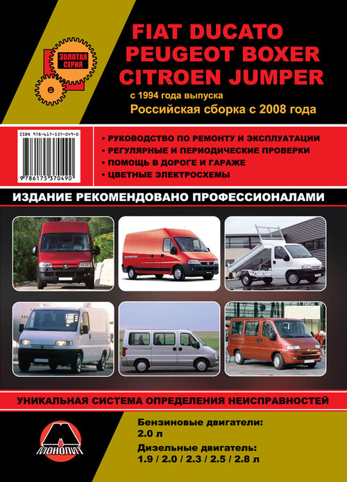 Предлагаем очередную брошюру Золотой серии автоиздательства Монолит руководство Citroen Jumper / Fiat Ducato / Peugeot Boxer, в которую вошли все нужные данные для проведения своевременного обслуживания и качественного ремонта, дано описание возможных неполадок двигателя автомобилей, их трансмиссии, ходовой части, рулевого управления, тормозной системы и т.д.