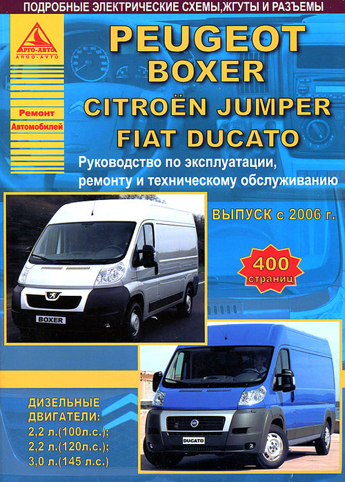 Справочное иллюстрированное издание Книга по ремонту Ситроен Джампер, Пежо Боксер, Фиат Дукато, а также руководство по эксплуатации и техническому обслуживанию, устройство Ситроен Джампер, Пежо Боксер, Фиат Дукато, которые производятся с 2006 года и оборудуются дизельными двигателями рабочим объемом 2,2 и 3,0 л. Ремонт узлов и агрегатов, эксплуатация, техобслуживание, электрические схемы.
