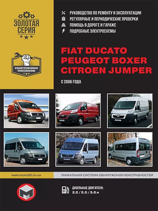 Руководство (мануал) по ремонту и эксплуатации Citroen Jumper, Peugeot Boxer и Fiat Ducato. В электронной книге рассмотрены автомобили третьего поколения с 2006 по 2022 года выпуска с дизельными двигателями.