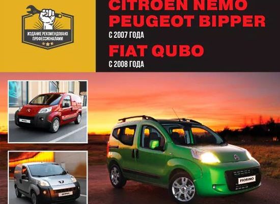 Руководство (мануал) по ремонту и эксплуатации Citroen Nemo / Peugeot Bipper, а также Fiat Fiorino и Qubo. В электронной книге рассмотрены автомобили первого поколения с 2007 по 2015 года выпуска с бензиновыми и дизельными двигателями.
