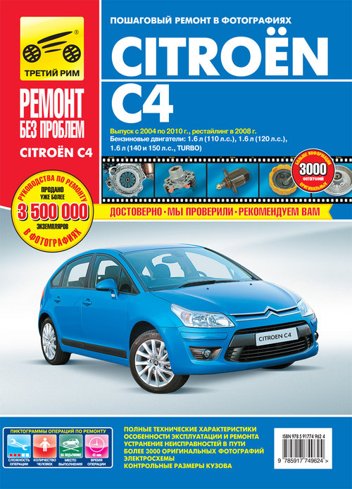 Цветное иллюстрированное справочное пособие по ремонту Citroen C4, а также руководство по эксплуатации и техническому обслуживанию Citroen C4, устройство автомобилей Citroen C4 2004-2010 гг. выпуска (включая рестайлинг 2008). Ситроен С4 оснащались бензиновыми моторами рабочим объемом 1,6 л. (110 л.с., 120 л.с., 140 л.с., 150 л.с. turbo).