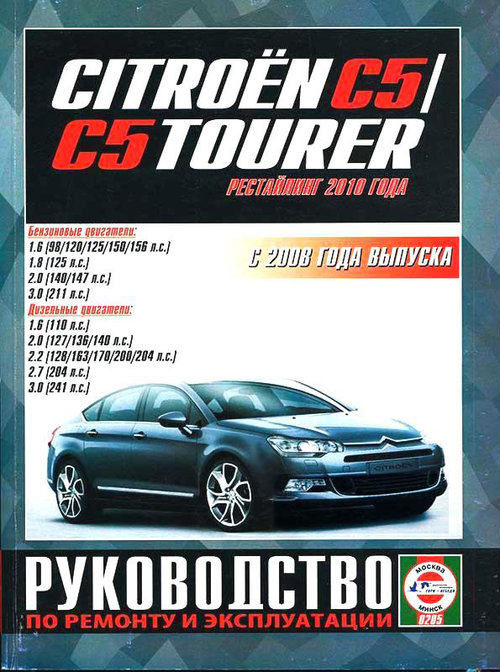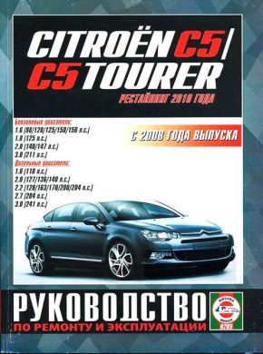 Подробное иллюстрированное издание Пособие по ремонту Ситроен С5, Ситроен С5 Турер, а также инструкция по техобслуживанию и эксплуатации, устройство Citroen C5 / C5 Tourer, выпуск которых производился с 2008 года. Модель оборудовалась бензиновыми двигателями рабочим объемом 1,6 (98/120/125/150/156 л.с.), 1,8 (125 л.с.), 2,0 (140/147 л.с.), 3,0 (211 л.с.), а также дизелями объемом 1,6 (110 л.с.), 2,0 (127/136/140 л.с.), 2,2 (204 л.с.), 2,7 (204 л.с.), 3,0 (241 л.с.).