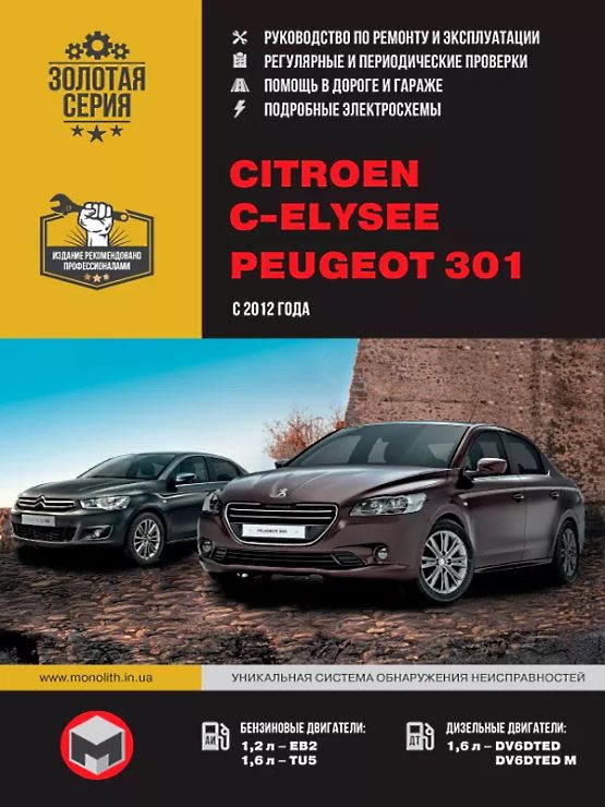 Руководство (мануал) по ремонту и эксплуатации Ситроен С-Элизэ и Пежо 301. В электронной книге рассмотрены автомобили первого поколения с 2012 по 2017 года выпуска.