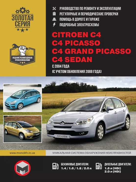 Руководство (мануал) по ремонту и эксплуатации Ситроен С4, а так же модификаций C4 Picasso / C4 Grand Picasso / C4 Sedan. В электронной книге рассмотрены автомобили первого поколения с 2004 по 2014 года выпуска.