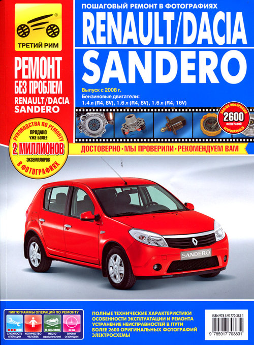 Цветное иллюстрированное справочное издание Руководство по ремонту Дачия Сандеро, Рено Сандеро, Сандеро Степвей, а также руководство по эксплуатации и техническому обслуживанию, устройство Dacia Sandero / Renault Sandero / Sandero Stepway с 2008 г. выпуска, оборудованных бензиновыми двигателями рабочим объемом 1,4 (R4, 8V) и 1,6 л. (R4, 8V и R4, 16V).