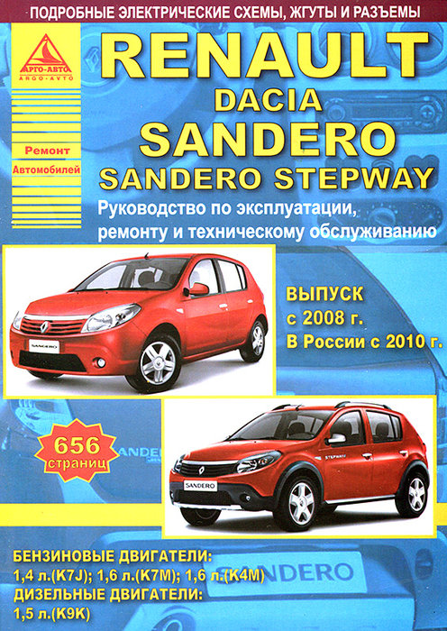 Подробнейшее иллюстрированное справочное издание Инструкция по ремонту Дачия Сандеро, Рено Сандеро, Сандеро Степвей, а также руководство по эксплуатации и техническому обслуживанию, устройство Дачия Сандеро, Рено Сандеро, Сандеро Степвей с 2008 г. выпуска (с 2010 в РФ), оборудованных бензиновыми агрегатами рабочим объемом 1,4 (K7J), 1,6 (K7M), 1,6 л. (K4M) и дизельными моторами литражом 1,5 (К9К).