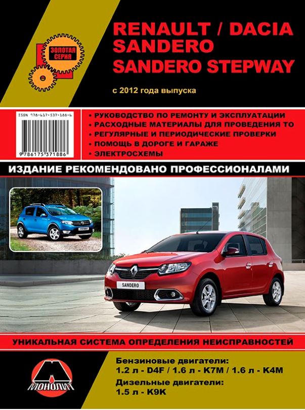 Известное и популярное среди автолюбителей издательство Монолит в рамках Золотой серии выпустило очередное качественное ремонтное пособие. Настоящий мануал понятным языком и максимально подробно расскажет своему будущему пользователю обо всех особенностях эксплуатации автомобиля и его технического обслуживания, даст необходимые рекомендации по проведению диагностики неполадок (чему очень поможет уникальная система определения неисправностей, разработанная специалистами издательства), регулировке и ремонту систем, узлов и агрегатов Dacia Sandero / Renault Sandero / Stepway.