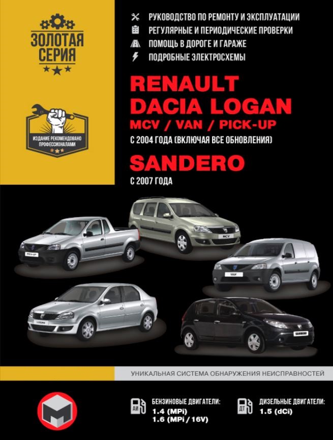 Справочное иллюстрированное издание Пособие по ремонту Dacia Sandero / Logan / MCV / Van / Pic-Up / Renault Sandero / Renault Logan, устройство, руководство по эксплуатации и техническому обслуживанию Dacia Sandero / Logan / MCV / Van / Pic-Up / Renault Logan с 2004 г. выпуска со всеми обновлениями и Renault Sandero, который выпускается с 2007 года. Автомобили оборудованы бензиновыми двигателями литражом 1,4 (MPi), 1,6 (MPi) 1,6 (16V), а также дизелем литражом 1,5 (dCi).