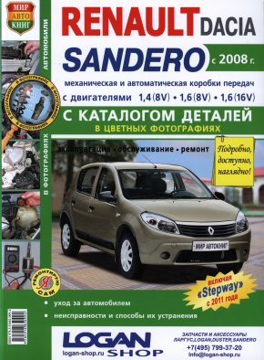 Цветное иллюстрированное пособие по ремонту Dacia Sandero / Renault Sandero, пособие по техническому обслуживанию автомобилей Дача Сандеро / Рено Сандеро с 2008 года выпуска, а также модификации Stepway с 2011 года выпуска. Автомобили оснащаются двигателями рабочим объемом 1,4 л. (8V), 1,6 л. (8V), 1,6 л. (16V), механической и автоматической коробками передач. Каталог деталей Дача Сандеро. Ремонт узлов и агрегатов Дачиа Сандеро. Эксплуатация, устройство, электросхемы.