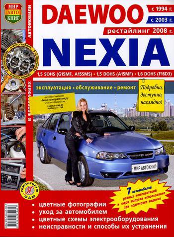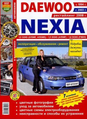 Руководство по ремонту, эксплуатации и техническому обслуживанию, устройство автомобилей Daewoo Nexia с 1994, 2003 и рестайлинговые модели с 2008 г. выпуска, оборудованных бензиновыми двигателями рабочим объемом 1,5, 1,6 л. – 1,5 SOHS (G15MF, A15SMS), 1,5 DOHS (A15MF), 1,6 DOHS (F16D3). Цветное иллюстрированное практическое пособие. В издании рассмотрены 7 моделей различной комплектации Дэу Нексия.