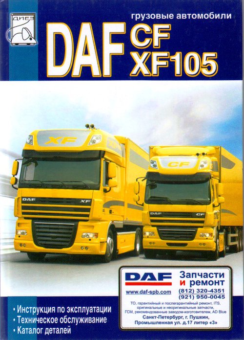 Справочно-информационная книга руководство по ремонту DAF CF, DAF XF105, а также руководство по эксплуатации и техническому обслуживанию грузовых автомобилей DAF CF, DAF XF105, каталог запчастей DAF CF, DAF XF105.
