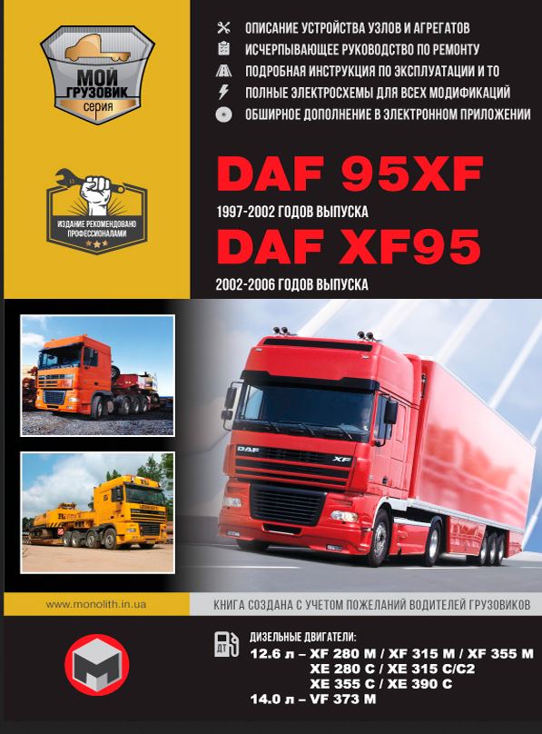 Справочно-информационная, рекомендованная опытными профессионалами инструкция по ремонту DАF 95XF 1997-2002 гг. выпуска, DАF XF95 2002-2006 гг. выпуска, а также руководство по эксплуатации и техобслуживанию грузовых автомобилей DАF 95XF, DАF XF95 + каталог запчастей DАF 95XF, DАF XF95. Машины оснащены дизелями литражом 12,6 и 14. Устройство автомобилей. Инструкция по эксплуатации. Техническое обслуживание. Электросхемы. Коды неисправностей ДАФ ХФ 95. Ремонт узлов и агрегатов.