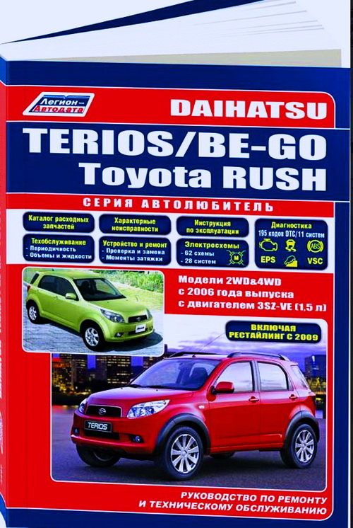 Справочно-информационное иллюстрированное издание руководство по обслуживанию Daihatsu Terios / Daihatsu Be-Go, Toyota Rush, также в книге рассмотрено устройство Дайхатсу Териос, Дайхатсу Би-Го, Тойота Раш, представлена инструкция по эксплуатации и техобслуживанию Дайхатсу Териос, Дайхатсу Би-Го, Тойота Раш, которые производятся с 2006 года. Оснащаются эти заднеприводные и полноприводные модели бензиновыми моторами 3SZ-VE рабочим объемом 1,5 л. Ремонт узлов и агрегатов. Рекомендации по эксплуатации и ТО. Схемы электрических соединений.