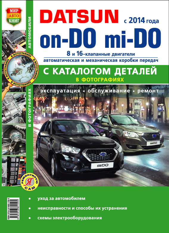 Книга по ремонту Датсун Ондо, руководство по ремонту и эксплуатации Datsun On-Do с 2014 г. выпуска. Бензиновый двигтаель объемом 1,6 литра. Ремонт в фотографиях. Каталог запчастей. Уход за автомобилем. Инструкция по эксплуатации. Схемы электрооборудования.